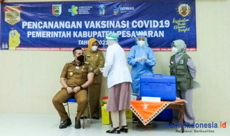 Orang pertama yang dilakukan Penyuntikan Vaksin Covid-19 adalah Bupati Pesawaran Dendi Ramadhona, Selasa (26/01).