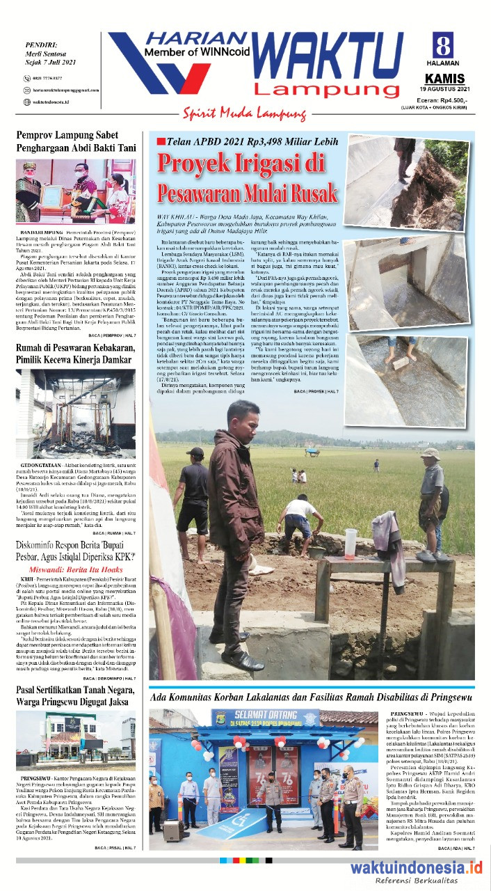Beranda Netter Harian Waktu Lampung, 19 Agustus 2021 Harian Waktu Lampung, 19 Agustus 2021waktuindonesia.id - Netter19 Agustus 2021 1:18 am KomentarBagikan KomentarBagikanBaca JugaPak Cik Ingatkan Marsono, Tidak Ngaku-ngaku Paman DendiSejumlah Program Pemberdayaan Perempuan Dirumuskan, Fatayat NU Gelar Harlah di PesawaranPastikan Kesiapan Opsen PKB dan BBNKB, Bapenda Lampung Sambangi LamtimKejari Lamtim Gelar Penerangan Hukum di Kemenag
