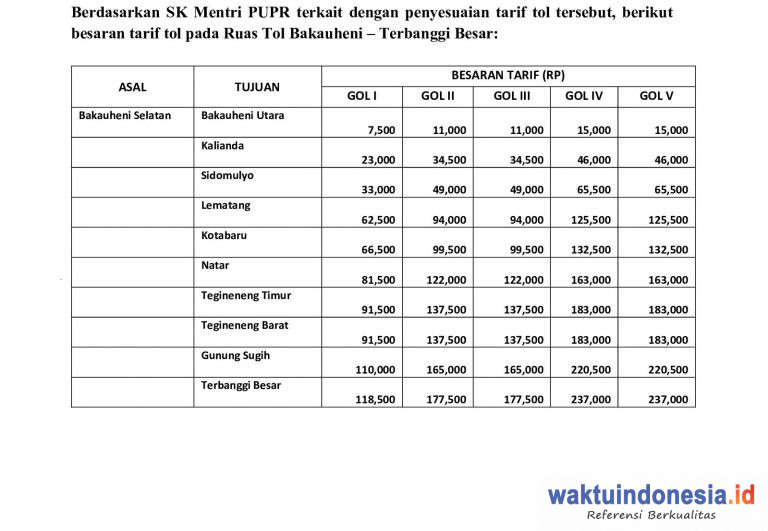 BANDARLAMPUNG, WAKTUINDONESIA – PT Hutama Karya (HK) mulai memberlakukan tarif baru Jalan Tol Trans Sumatera (JTTS) ruas Bakauheni-Terbanggibesar (Bakter) pada Minggu 29 Agustus mendatang.