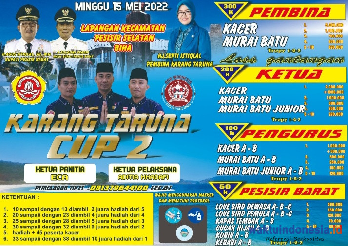 KRUI, WAKTUINDONESIA – Karang Taruna Kabupaten Pesisir Barat (Pesibar) Provinsi Lampung akan menggelar lomba burung berkicau.