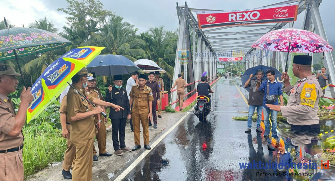 KRUI, WAKTUINDONESIA – Bupati Pesisir Barat (Pesibar), Agus Istiqlal, didampingi Ketua Dewan Perwakilan Rakyat Daerah (DPRD) Pesibar, Agus Cik, perwakilan Balai Pelaksanaan Jalan Nasional (BPJN) Wilayah 2.3, Plt Sekkab Pesibar, Jalaludin, Kepala Dinas Komunikasi Informatika dan Persandian (Diskominfotiksan), Suryadi, Kepala Dinas Perhubungan (Dishub), Camat Karyapenggawa, dan beberapa peratin di Karyapenggawa meninjau lokasi rusaknya jalan dan beronjong jembatan yang disebabkan banjir akibat tingginya curah hujan, Selasa, 18 Oktober 2022.