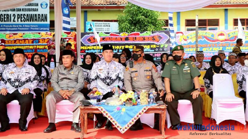 TELUK PANDAN, WAKTUINDONESIA – Bupati Pesawaran Dendi Ramadhona hadiri kegiatan upacara peringatan Hari Guru Nasional tahun 2022 dan HUT PGRI ke-77 di Lapangan Kridayuana Kecamatan Teluk Pandan kabupaten setempat, Jumat 2 Desember 2022.