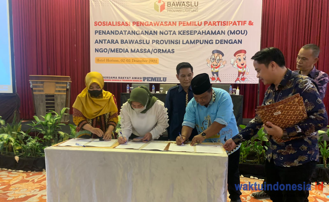 MoU ditandatangani Ketua Bawaslu Lampung Iskardo P Panggar yang diwakili oleh Koordinator Divisi Pencegahan dan Partisipasi Masyarakat Karno Ahmad Satarya dan perwakilan beberapa organisasi.