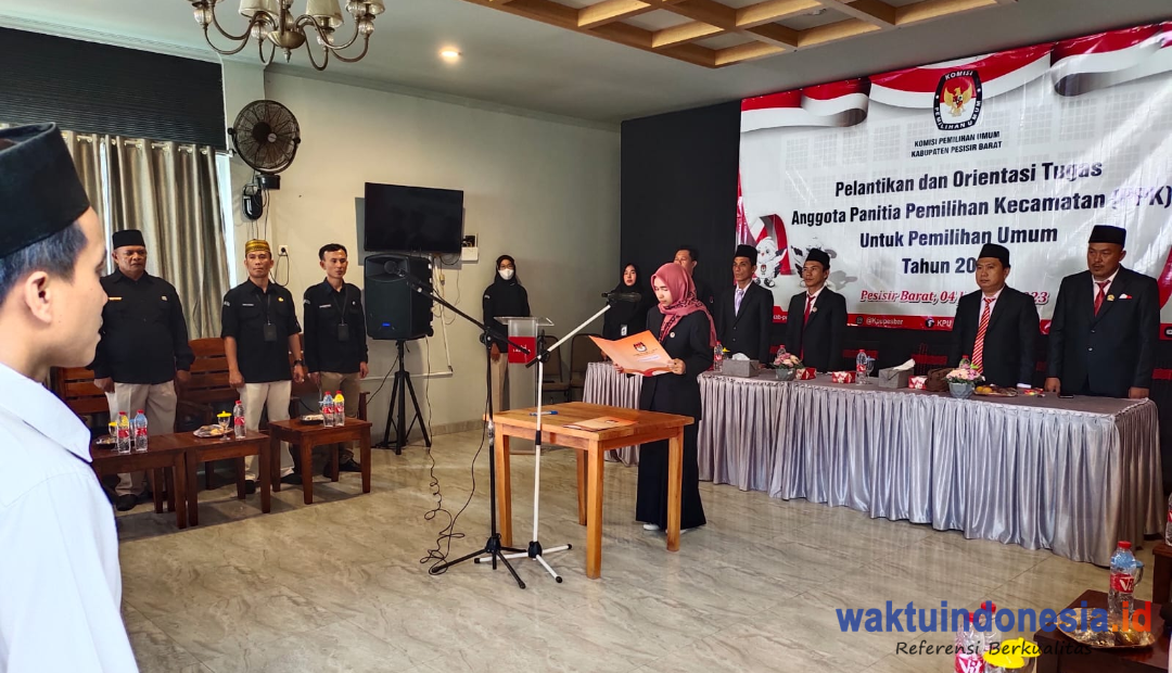 KRUI, WAKTUINDONESIA – Komisi Pemilihan Umum (KPU) Kabupaten Pesisir Barat (Pesibar) menggelar pelantikan 55 anggota Panitia Pemilihan Kecamatan (PPK) terpilih untuk Pemilihan Umum (Pemilu) Tahun 2024, di aula Hotel Sartika Kecamatan Pesisir Tengah, Rabu, 4 Desember 2023.