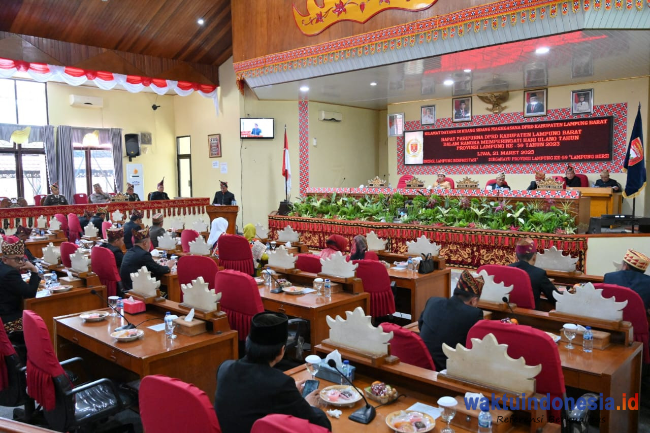 WAKTU LAMPUNG – Dewan Perwakilan Rakyat Daerah (DPRD) Lampung Barat (Lambar) menggelar rapat paripurna istimewa dalam rangka memperingati Hari Ulang Tahun (HUT) ke-59 Provinsi Lampung di Ruang Sidang Maghgasana DPRD Lambar, Selasa (21/03/23).