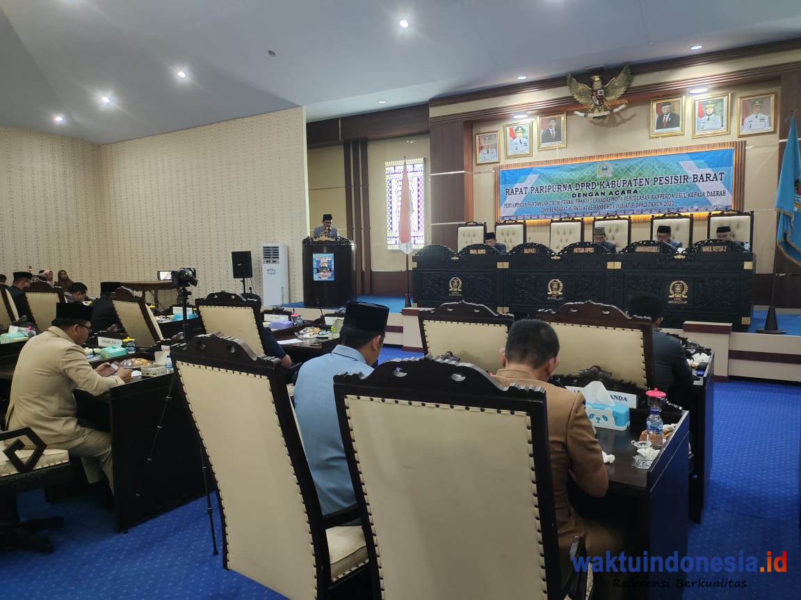 Rapat paripurna yang dihadiri 18 anggota dari 25 anggota itu dipimpin Wakil Ketua I, Ripzon Efendi, dan dihadiri langsung Bupati-Wakil Bupati Pesisir Barat (Pesibar), Agus Istiqlal, – A. Zulqoini Syarif. Turutin hadir juga pejabat tinggi pratama, administrator, pengawas, dan pelaksana di lingkungan Pemkab Pesibar, dan forkopimda Pesibar-Lampung Barat (Lambar).