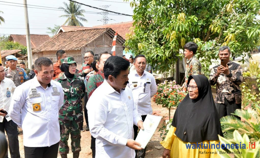 TEGINENENG, WAKTUINDONESIA – Menteri Agraria dan Tata Ruang/Kepala Badan Pertanahan Nasional (ATR/BPN) Hadi Tjahjanto dan Bupati Pesawaran Dendi Ramadhona resmi menyerahkan sertifikat tanah kepada warga Kabupaten Pesawaran, Lampung, Kamis 26 Oktober 2023.