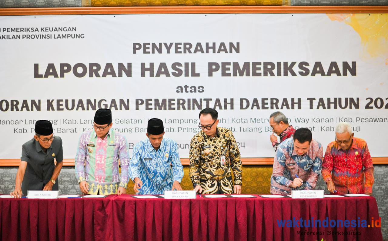 WAKTUINDONESIA – Pemerintah Kabupaten Pesawaran, kembali meraih opini Wajar Tanpa Pengecualian (WTP) atas laporan hasil pemeriksaan BPK atas Laporan Keuangan Pemerintah Daerah (LKPD) Tahun 2023 di Kantor Perwakilan BPK RI Provinsi Lampung, Bandar Lampung, Jumat 3 Mei 2024.