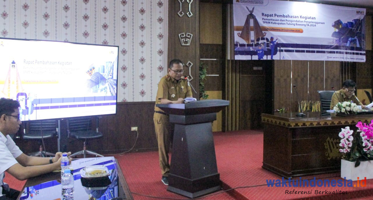WAKTU INDONESIA – Pj Sekdakab Tulang Bawang (Tuba) Haryanto menghadiri sekaligus memberikan sambutan rapat pembahasan terkait pemantauan dan pengendalian penyelenggaraan sistem penyediaan air minum (SPAM) tahun anggaran 2024 dalam agenda penyerahan hibah dan perencanaan kegiatan tahun anggaran 2025 di Ruang Rapat Utama lantai II kantor Bupati setempat.